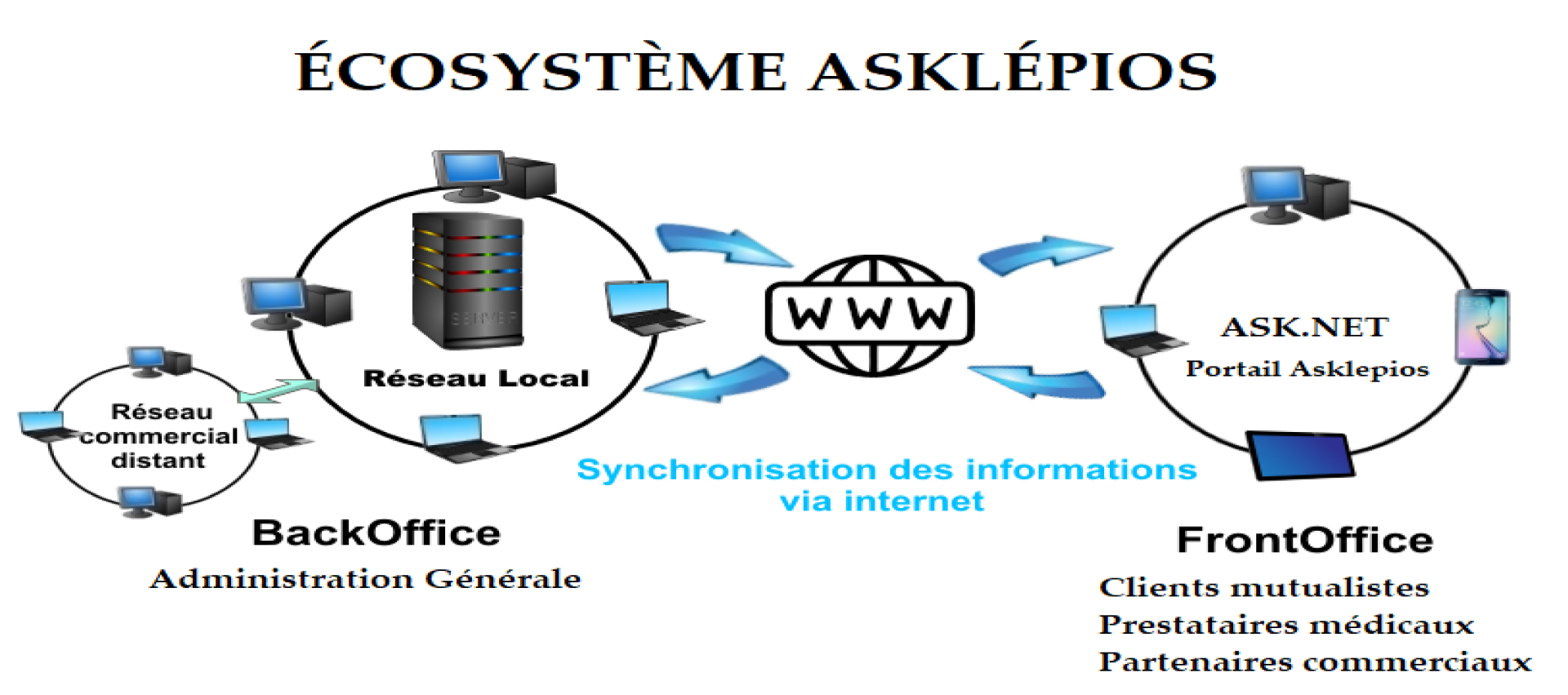 - Le Frontoffice ASK.NET qui est la partie en ligne, le portail Web. Via à internet, les clients mutualistes et tous les collaborateurs de la mutuelle (prestataires médicaux et partenaires commerciaux) accèdent à leurs comptes et aux opérations pour lesquelles ils sont habilités.